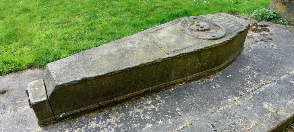 I then followed the old quarry road downhill, taking a footpath to a road before reaching Main Street in Billinge coming out opposite St Aidan’s Church. The graveyard has an interesting if not macabre ‘coffin shaped’ grave with a skull and a winged serpent on it which dates back to 1720. It’s the grave of George and Kitty Smith and rumour has it that the couple died after being bitten by snakes on Billinge Hill. Luckily, I didn’t see any snakes today!!