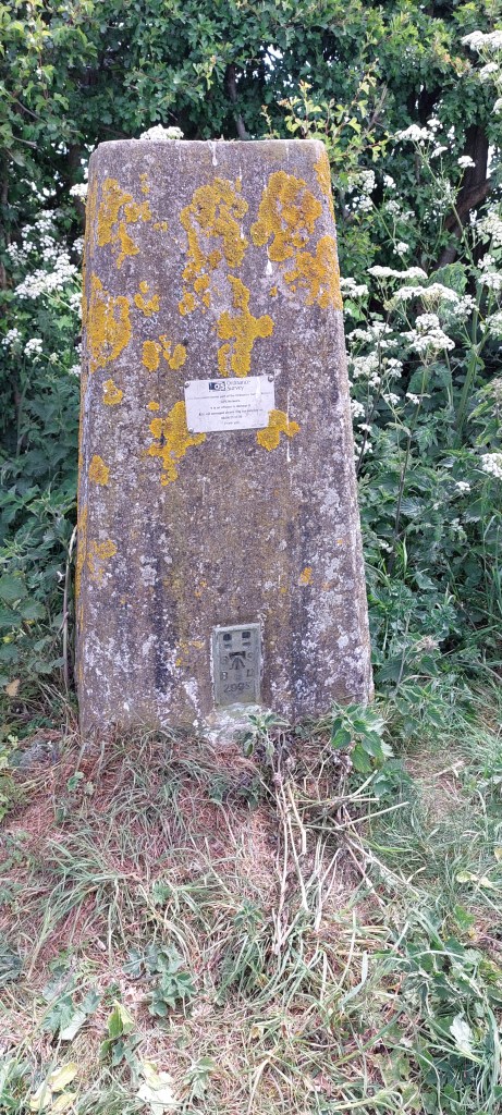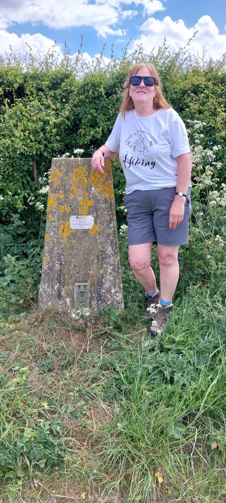 We turned left to follow the track to a gate, continuing in an easterly direction and past another Viking Way sign which pointed north down a shallow valley until we reached a telegraph pole opposite a hedge which followed a southerly direction. This would have given us direct access to the trig point at the summit but as the gate was locked, we had to find a gap in the hedge on the right which we went through, climbing up a fairly steep bank and doubling back on ourselves to a hedge, which we followed gently uphill for around 400m to the summit and the trig point of Normanby Hill. The radar station ‘golf ball’ can be seen over to the South East.