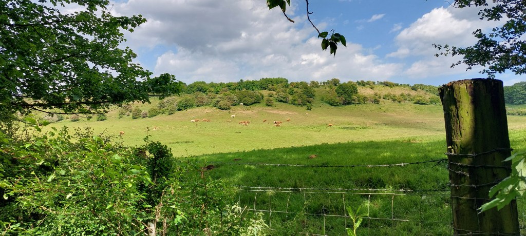 The path split near the top so we took the right fork to the crest of the hill. We were able to follow an obvious path which was easy enough to follow. It took us through woodland, crossing a couple of stiles taking us to the left side of the fence. We then had a choice of paths to take but took the one we thought was going in the right direction which turned out to be the correct path.