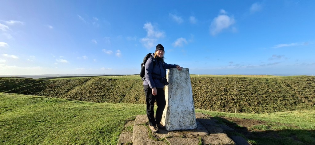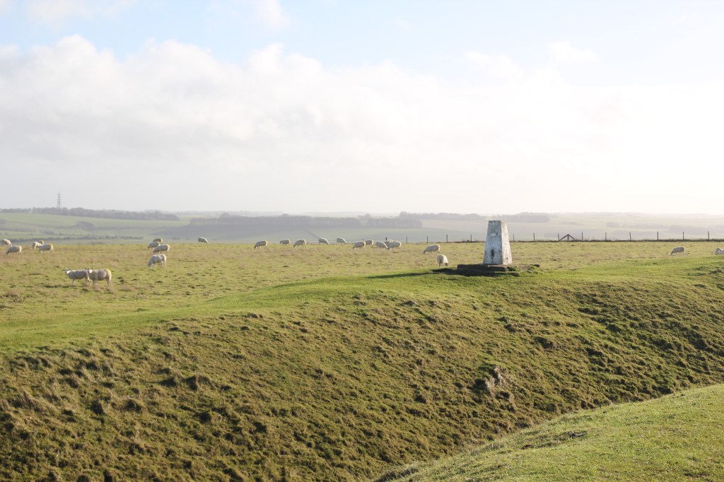The path went uphill towards Uffington Castle. I decided this would also be a good place to explore and of course the trig point at the top of White Horse Hill, the highest point of Oxfordshire. I went left through the gate at the top of the hill to the trig point initially where I had the obligatory photo taken. As it was such a lovely day, albeit quite breezy, there were a few people around to ask to take the photo instead of a bad selfie!