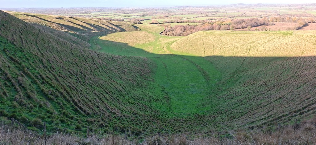 As I made my way downhill there were views of the villages of Fawler and Kingston Lisle and Oxford beyond the gap in the low hills. I continued downhill through a few kissing gates and then down a steep scarp slope where I slipped on a cow pat and ended up on my backside!! A good job nobody was around to see that!! On the right of this path was a valley created by the retreating ice during the last Ice Age.